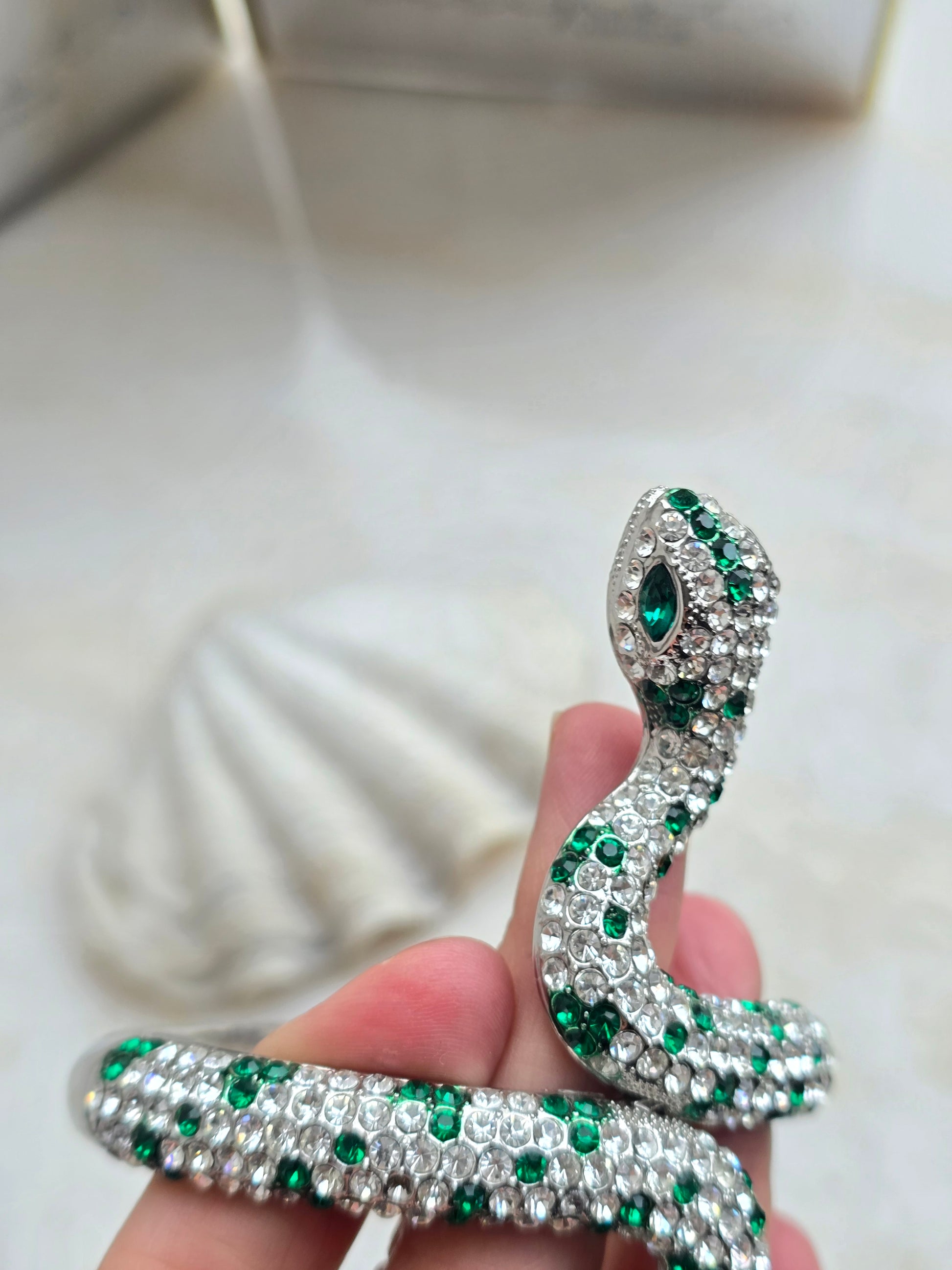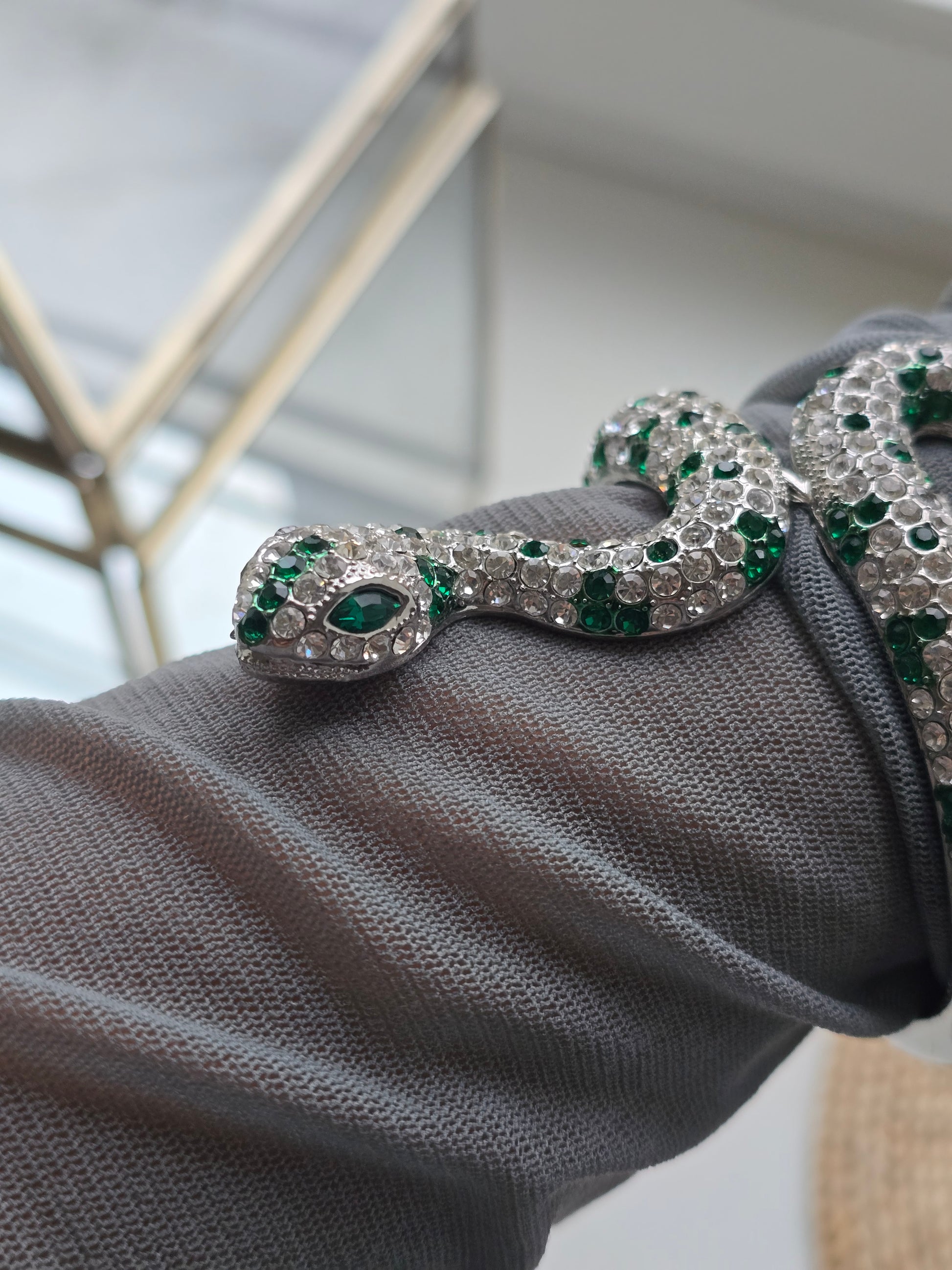 Sidabro spalvos masyvi apyrankė gyvatė su žėrinčiais stiklo kristalais