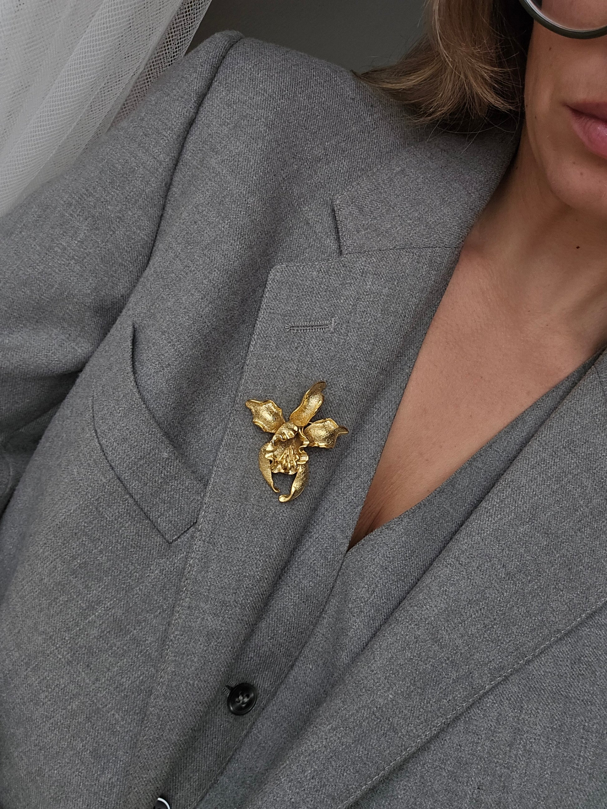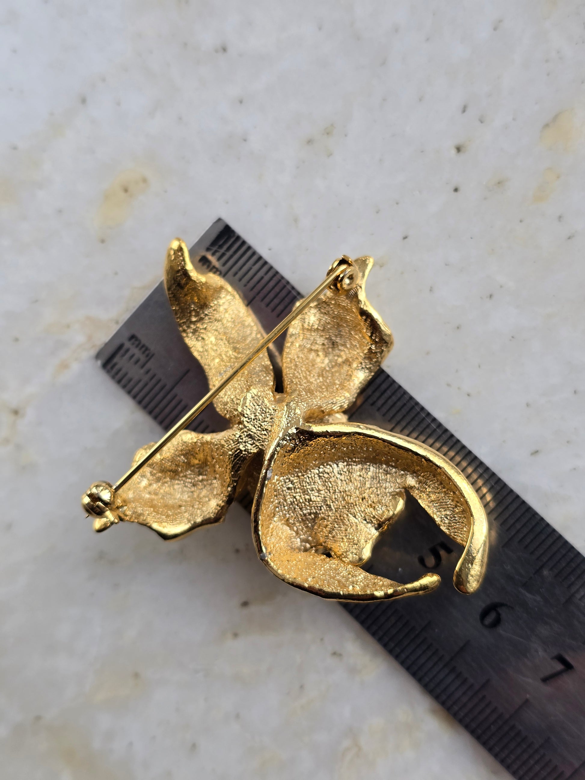 Vintažinė aukso spalvos sagė orchidėja