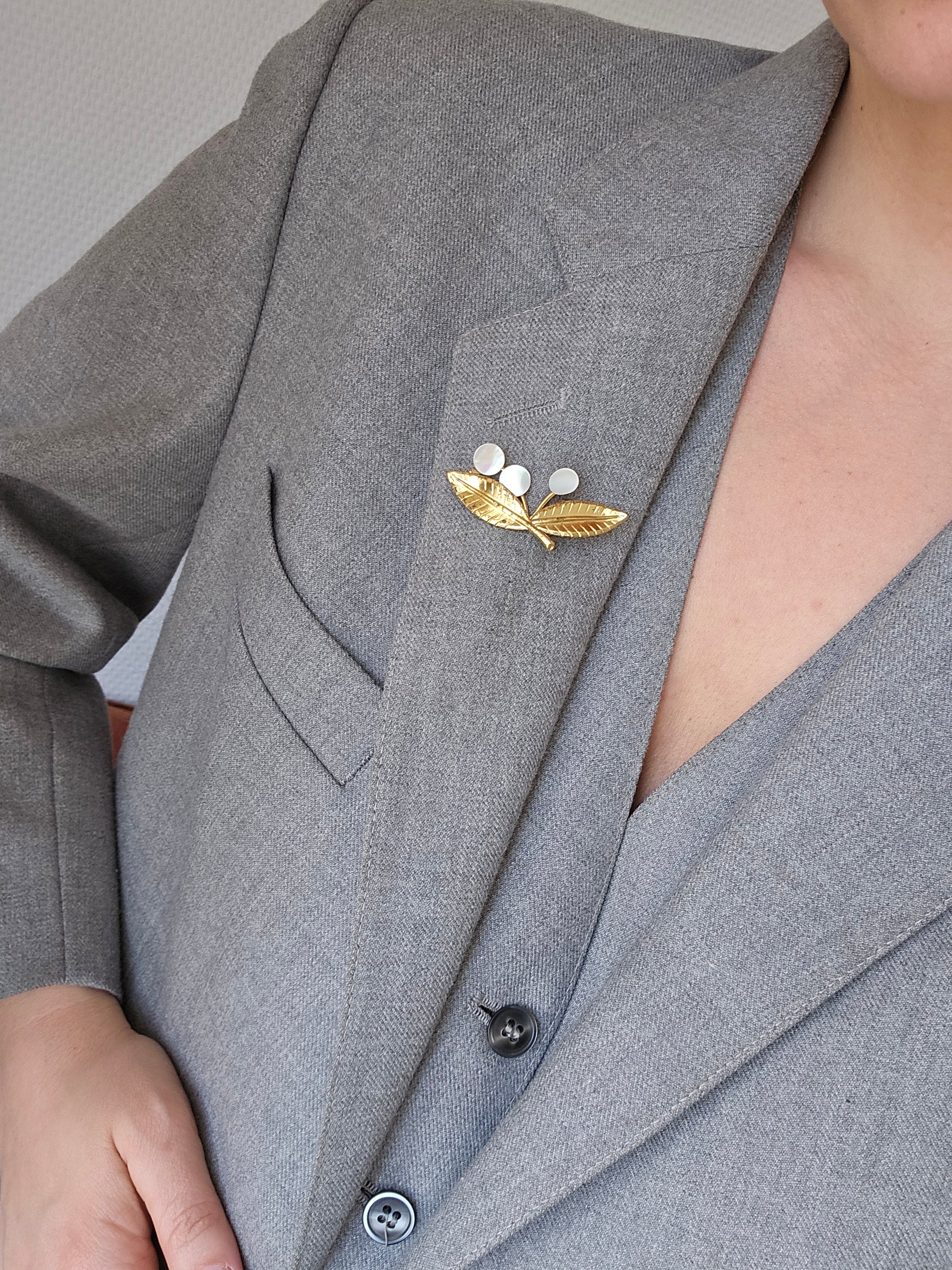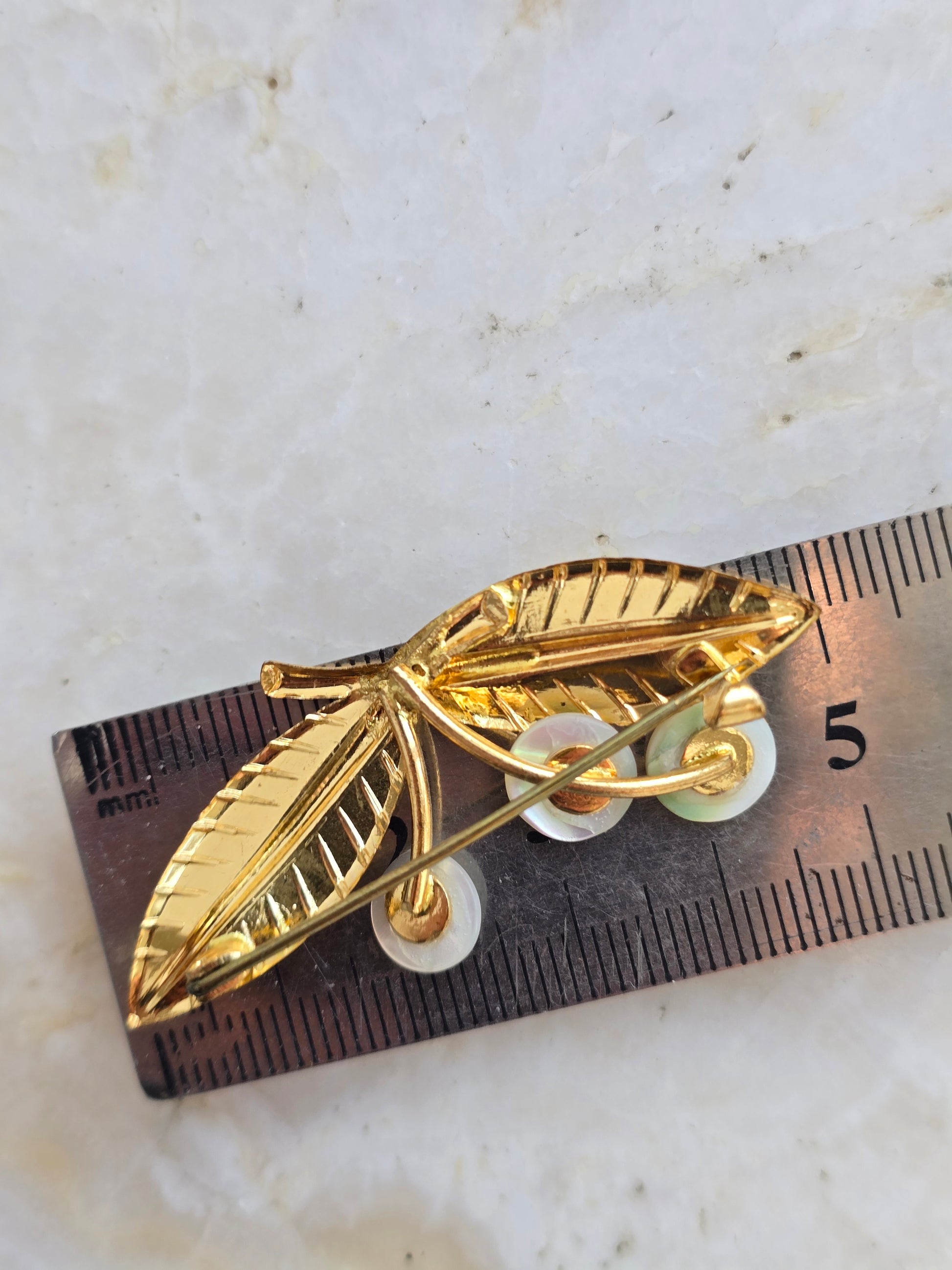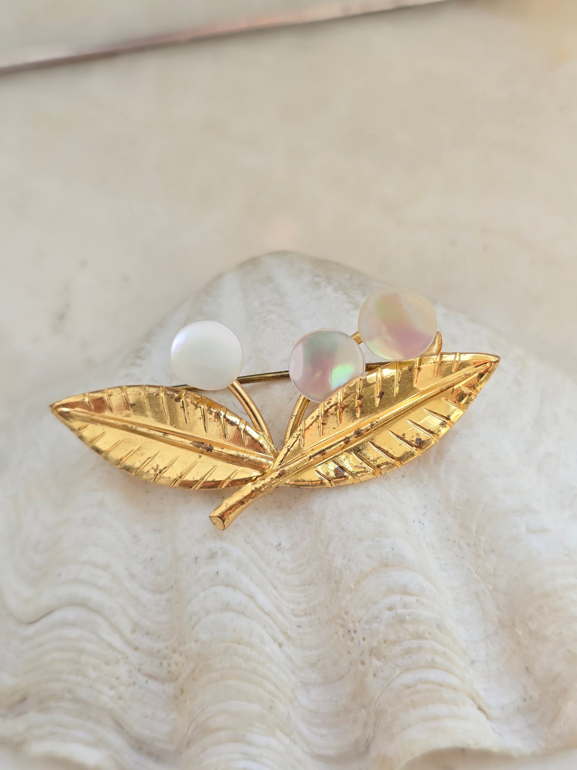 Vintažinė aukso spalvos sagė su kriauklės perlamutru