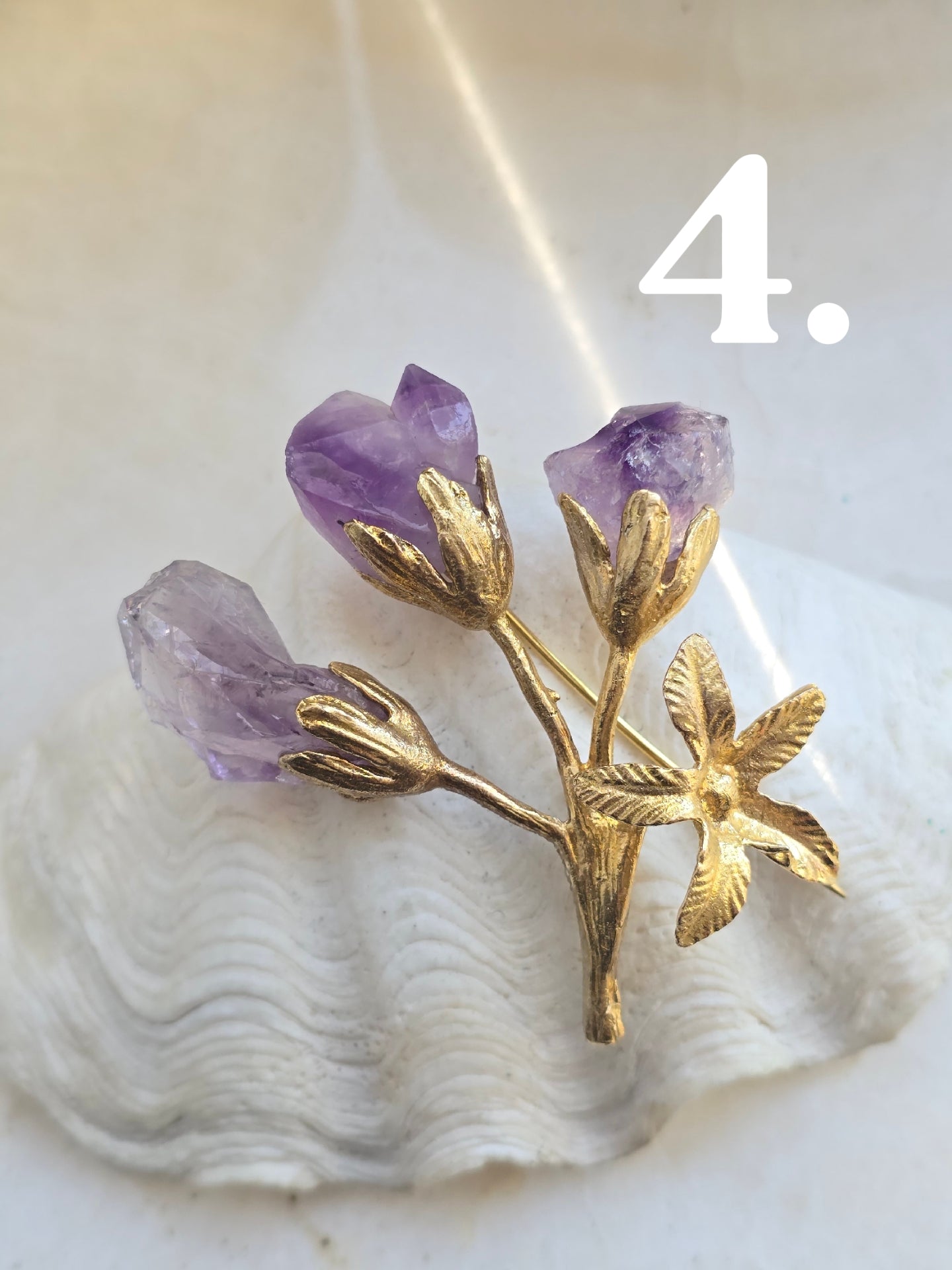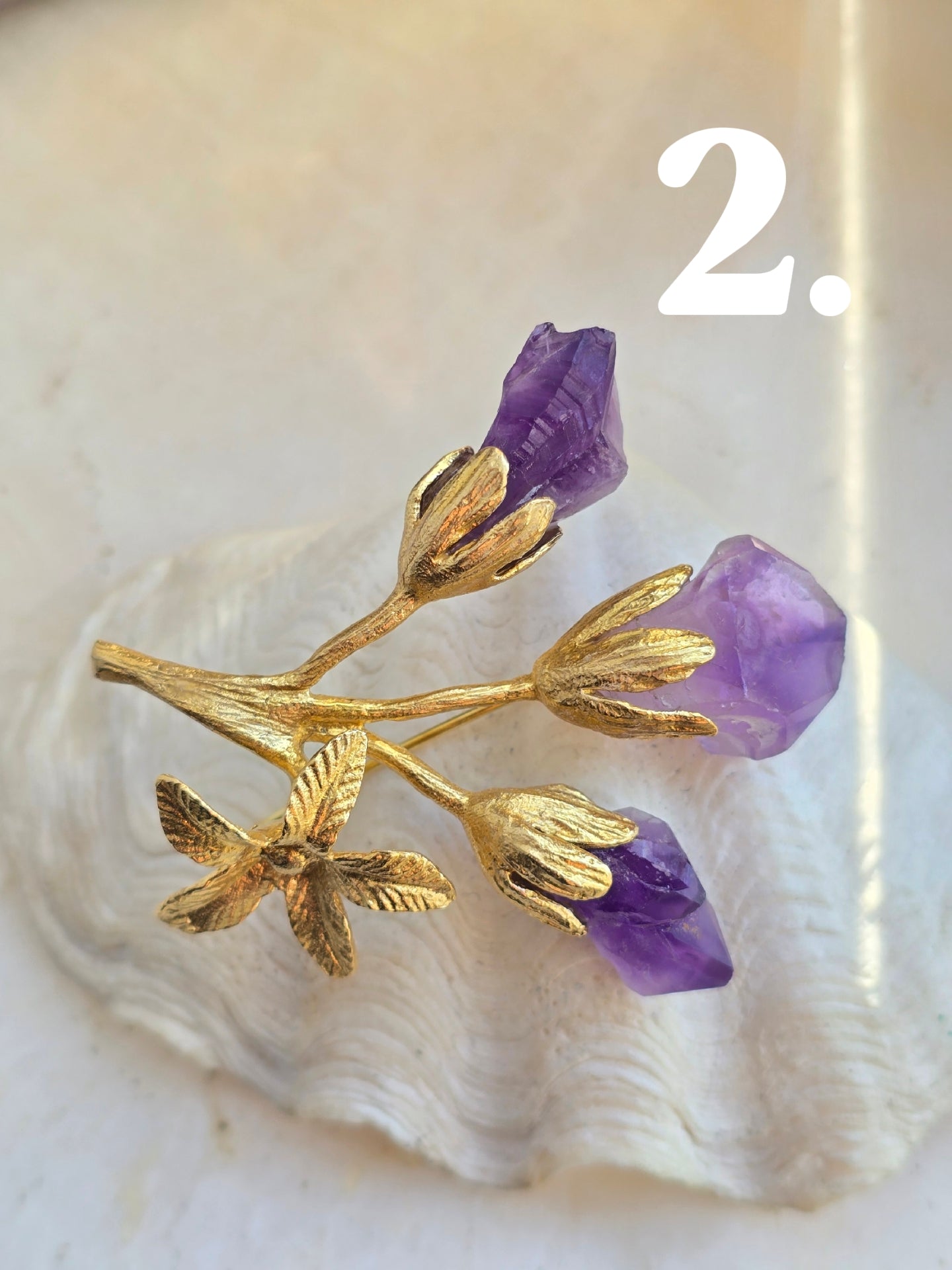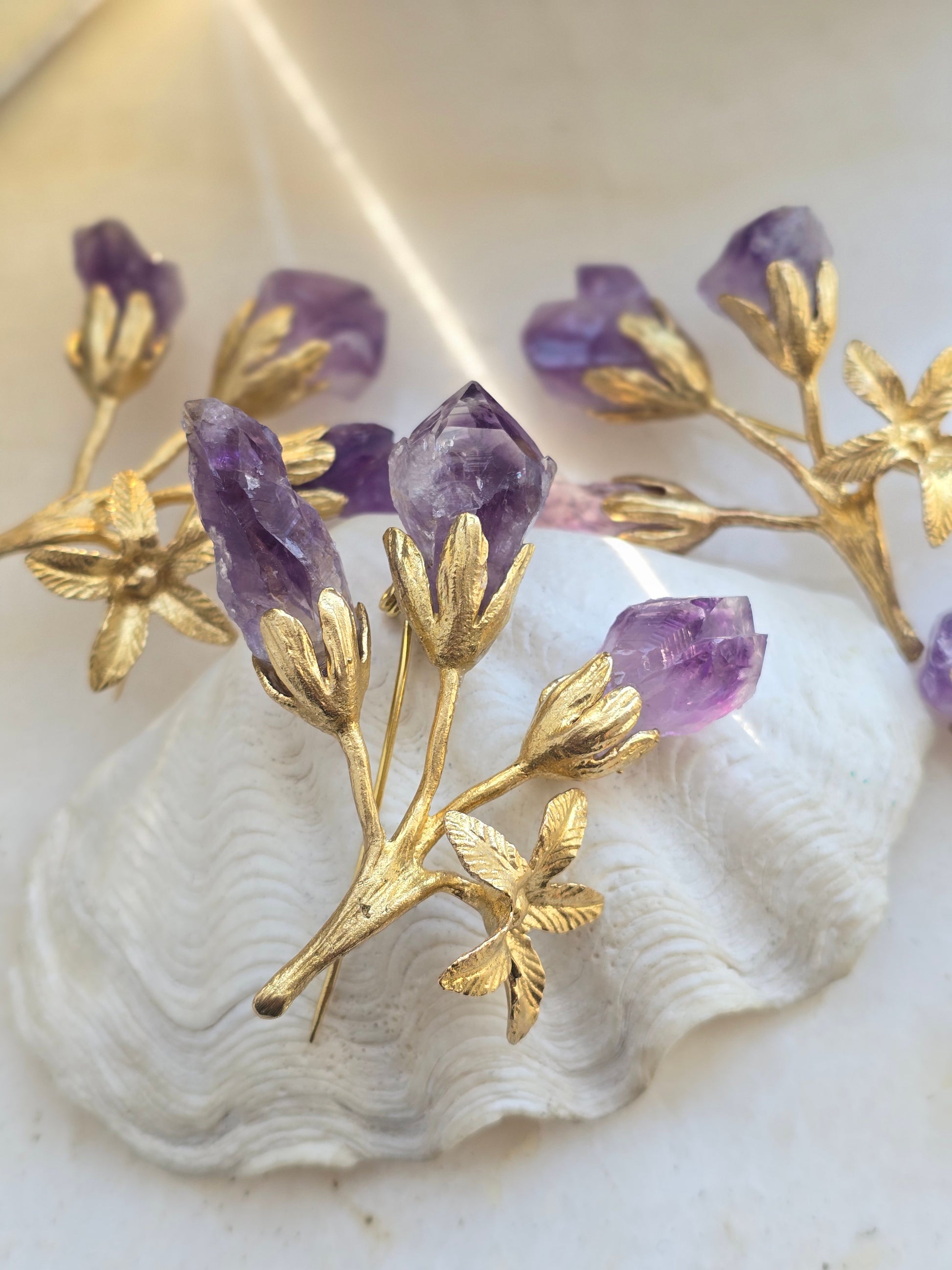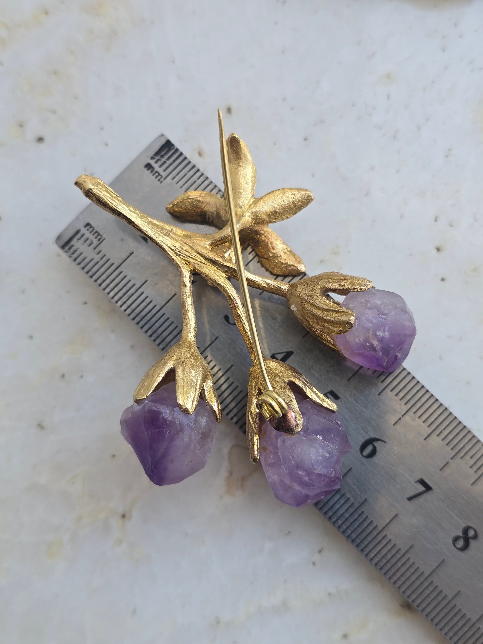 Žalvario spalvos sagė smeigtukas su natūraliais ametistuo akmens grynuoliais