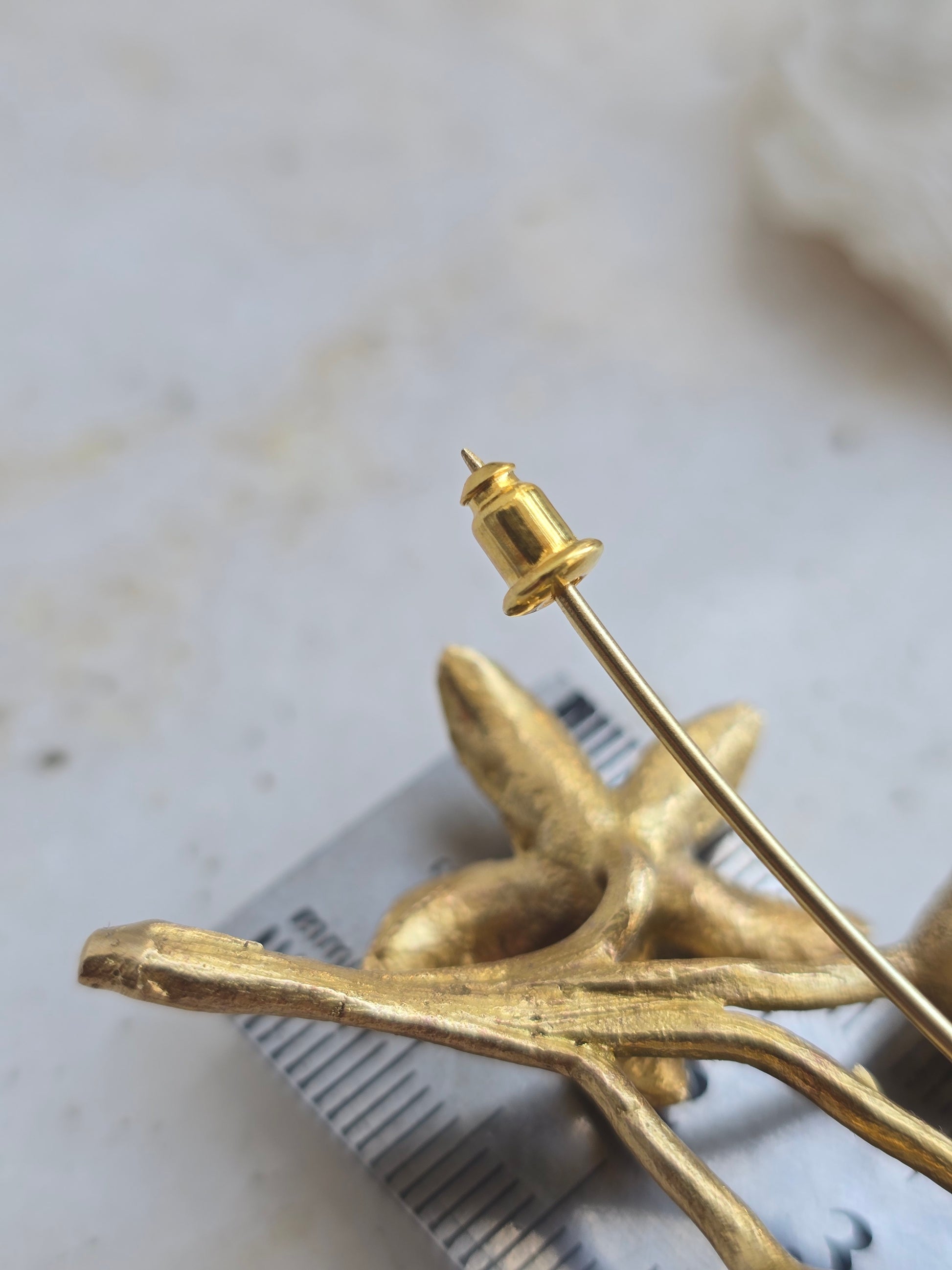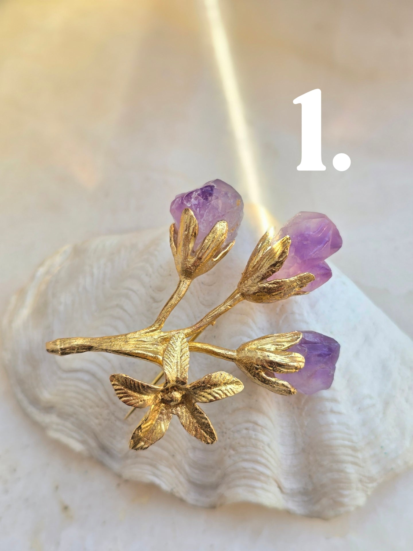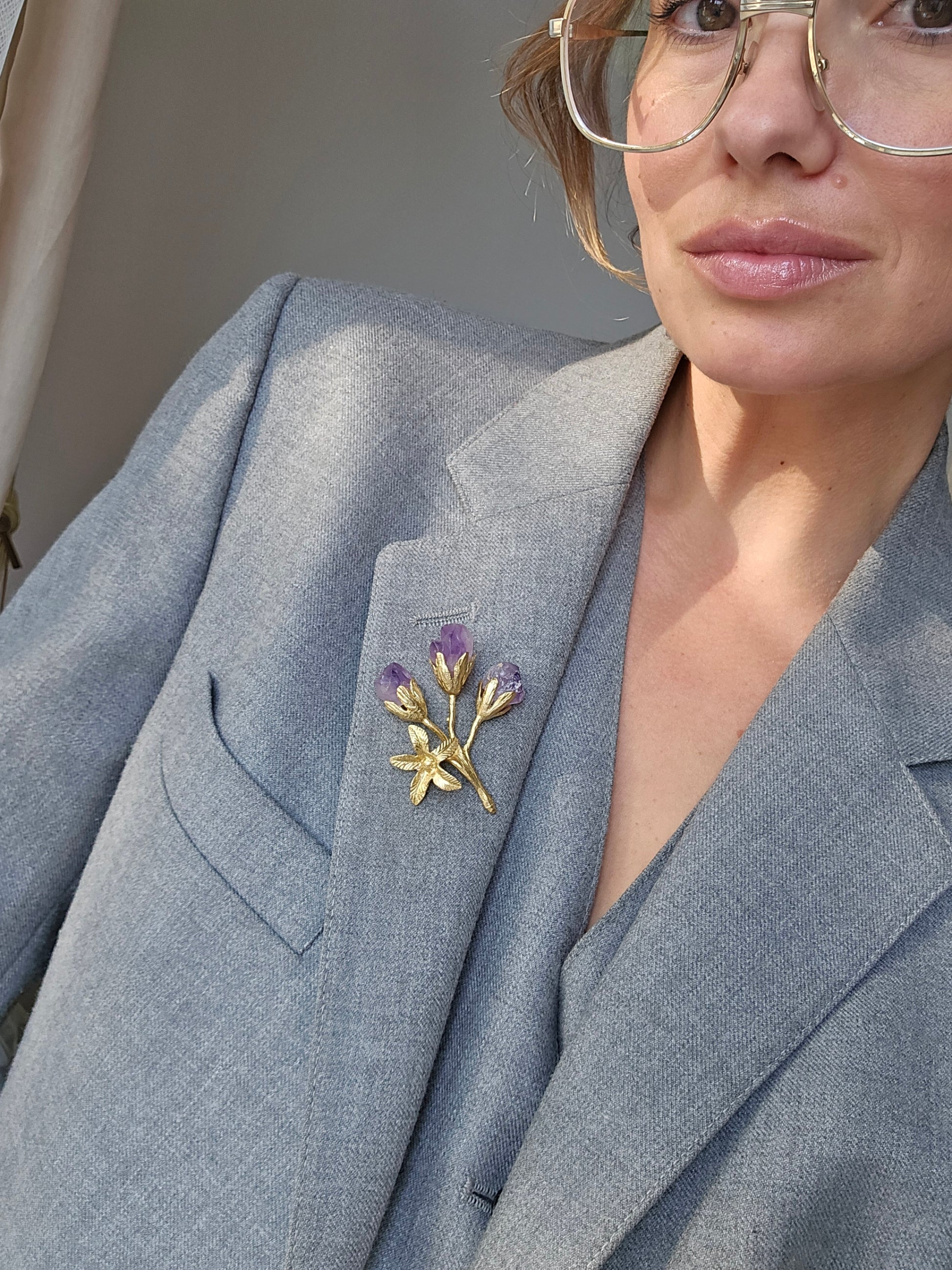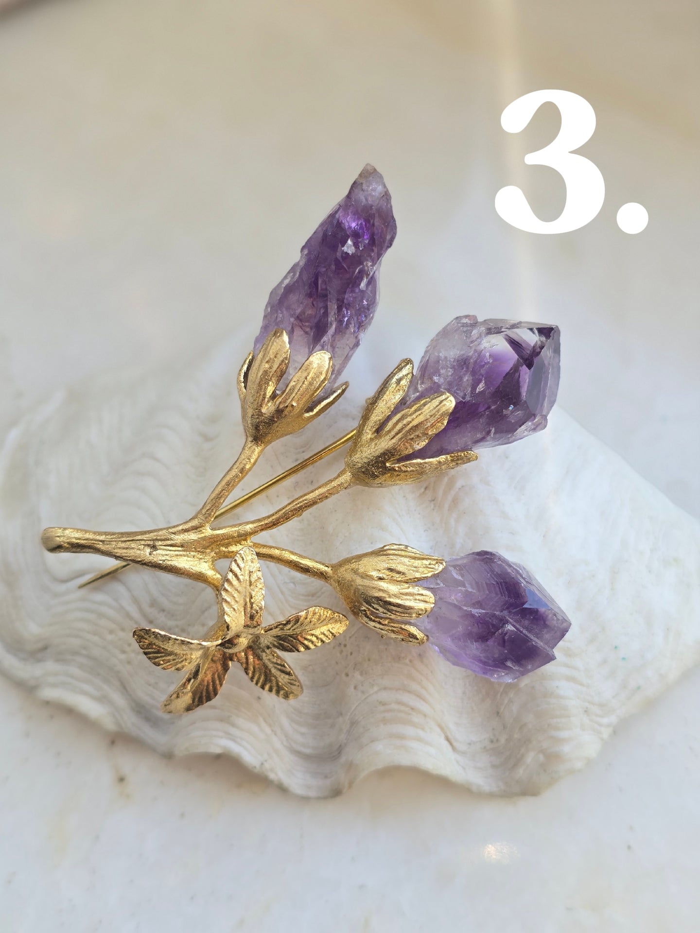 Žalvario spalvos sagė smeigtukas su natūraliais ametistuo akmens grynuoliais